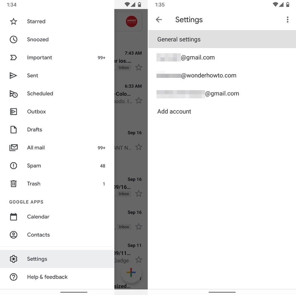 Mở ứng dụng Gmail (Android | iOS) và bấm nút trình đơn hình ba thanh ngang ở phía trên bên trái của màn hình. Chọn Settings (Cài đặt) từ trình đơn hiện ra, sau đó chọn General settings (Cài đặt chung) ở màn hình tiếp theo.