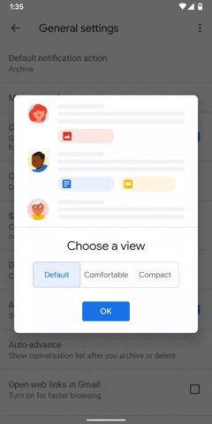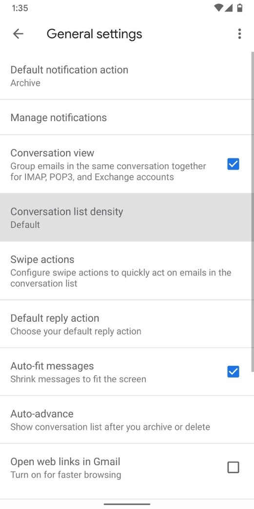 Bây giờ, bạn chọn Conversation list density (Mật độ danh sách cuộc trò chuyện).