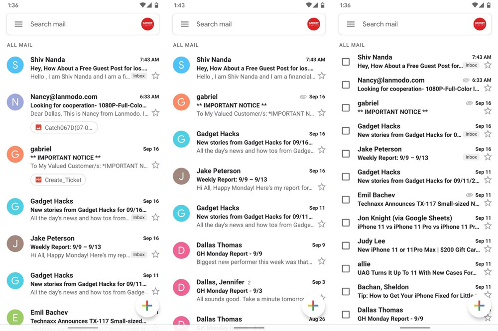 Chúng tôi thích hiển thị nhiều email trên màn hình chính hơn vì nhờ thế chúng tôi có thể lướt qua danh sách email nhanh hơn, không cần phải cuộn màn hình nhiều lần. Ngoài ra, với cách hiển thị này, Gmail sẽ bớt lộn xộn, đồng thời hiển thị ít các thông tin không liên quan hơn. Nhờ đó, chúng tôi sẽ tập trung hiệu quả hơn.