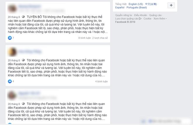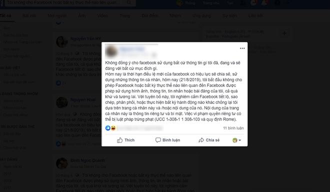 Cụ thể, những dòng chia sẻ của người dùng đều có chung nội dung: "Tôi không cho Facebook hoặc bất kỳ thực thể nào liên quan đến Facebook được phép sử dụng hình ảnh, thông tin, tin nhắn hoặc bài đăng của tôi, cả quá khứ và tương lai. Với tuyên bố này, tôi nghiêm cấm Facebook tiết lộ, sao chép, phân phối, hoặc thực hiện bất kỳ hành động nào khác chống lại tôi dựa trên trang cá nhân này và nội dung của nó. Nội dung của trang cá nhân này là thông tin riêng tư và bí mật. Việc vi phạm quyền riêng tư có thể bị luật pháp trừng phạt (UCC 1-308-1 1 308-103 và quy định Rome)".