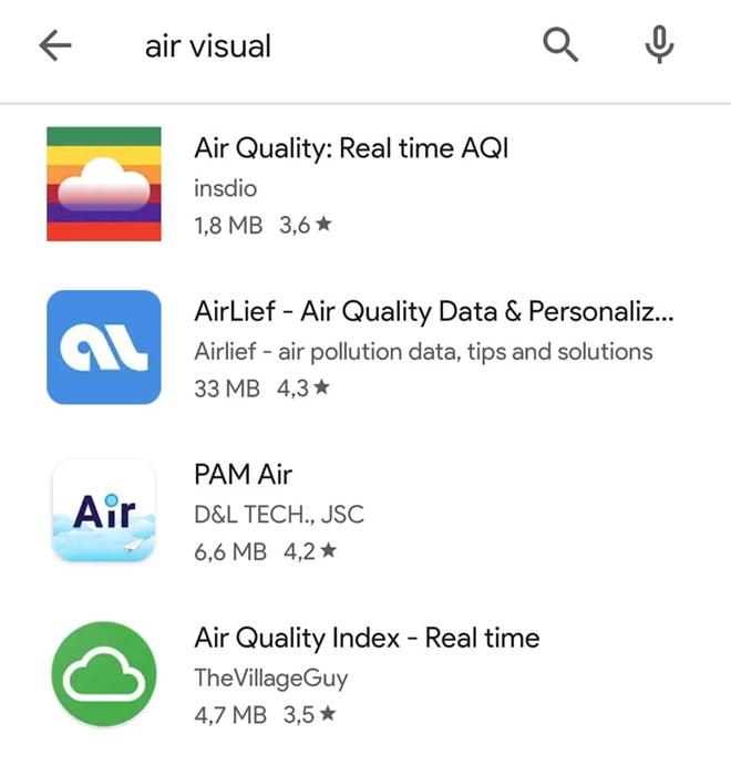 Tuy nhiên, mới đây, khi người dùng smartphone của cả Android lẫn iOS tìm kiếm ứng dụng đo lường chất lượng không khí AirVisual trên Play Store và AppStore đều không được. Ứng dụng AirVisual. Kết quả tìm kiếm trên trang web IQAir AirVisual, người dùng nhận được thông báo ứng dụng AirVisual “không có sẵn ở quốc gia của bạn".